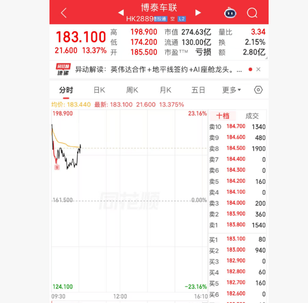 博泰車聯在資本市場表現強勁,24日開盤后股價迅速攀升,最高漲幅超過23%。截至上午10時34分,該公司股價報183.10港元/股,漲幅達13.37%,成交額突破2.80億港元,市場關注度顯著提升。